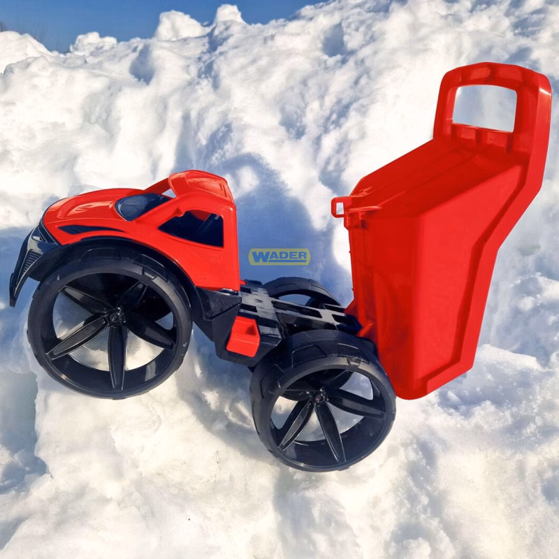Особенность модели — подвижный фиксатор, позволяющий открывать кузов для перевозки песка, игрушек или других предметов. Простая конструкция и небольшой вес делают его удобным для переноски и маневрирования как в доме, так и на улице.