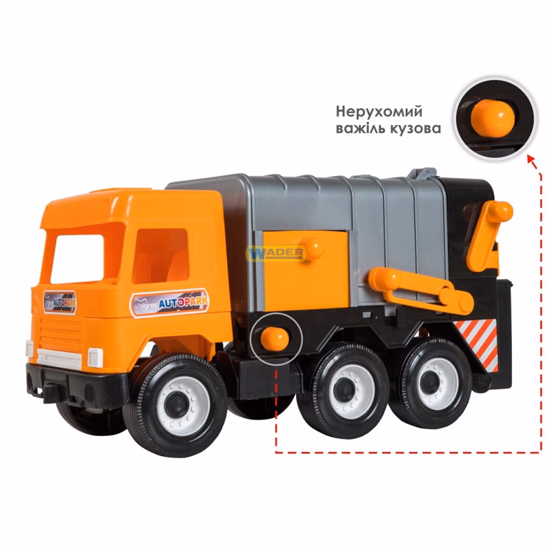 Мусоровоз исключительно прочен и высоко функционален. Кроме того, он выдержит и вес малыша, решившего прокатиться верхом на машинке.
