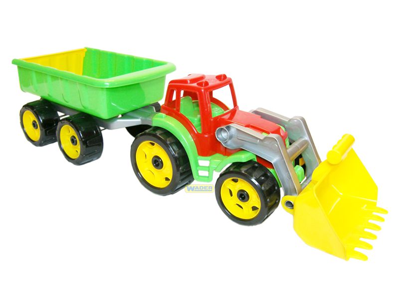 Яркий пластиковый трактор с ковшом спереди и прицепом сзади. Незаменимая вещь в строительных работах в песочнице.